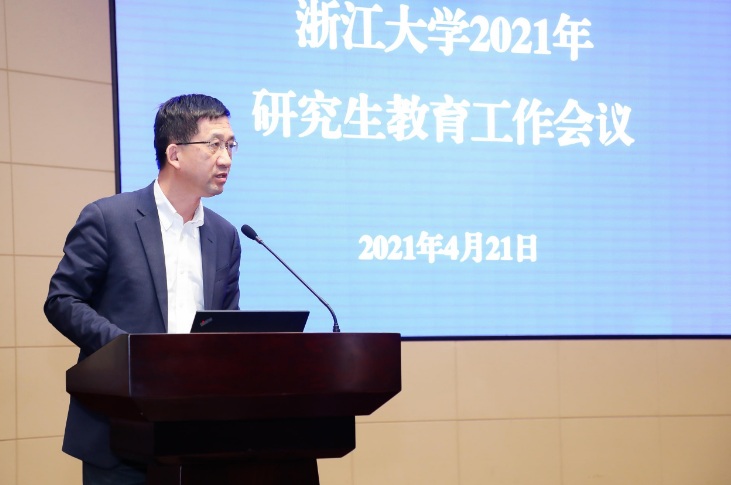 On the morning of April 21, the 2021 Graduate Education Working Conference at ZJU was held in the Linshui Lecture Hall of Zijingang Campus, Zhejiang University. Member of the CPC Committee and Vice President of ZJU Yan Jianhua, Deputy Secretary of the CPC Committee of ZJU Wu Xiaocheng attended the conference and delivered speeches. The conference was presided over by Bao Gang, Dean of Graduate School.